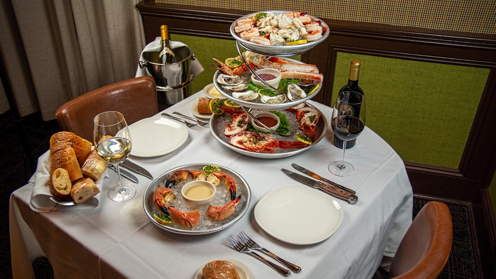 • Raw bar & stone crab claws served with red and white wine on an upstairs tableRaw bar & stone crab claws served with red and white wine on an upstairs table